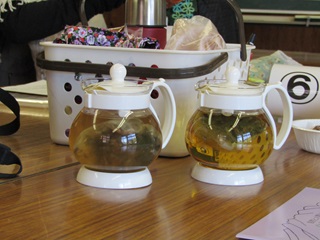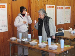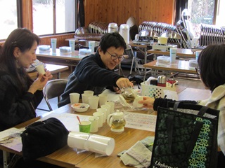 県民の森が準備した15種類の薬草茶の味と香りをひとつひとつ吟味した後、好みの茶葉をブレンド、試飲を繰り返してオリジナルティーを仕上げていただきました。「オオバコ飲みやすい」「15種類も味見すれば分からなくなってくるね」「金柑漬け美味しい」等々。ささやかなティータイムを楽しんでいただけたでしょうか。