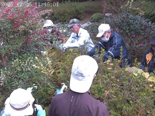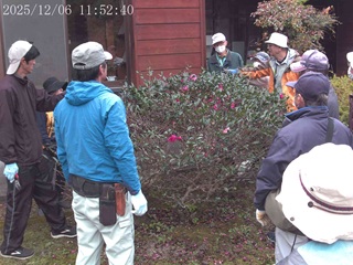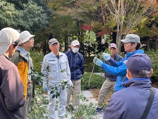 12月6日(土)に令和7年度第2回の「みどりの教室」を開催し、11名の方々に参加していただきました。剪定の基本や病害虫防除などの知識を学んだ後、講師の指導を受けながらヤマモモやツツジなどを皆さん方に剪定していただきました。最後に道具の手入れ方法やハサミ等の研ぎ方・メンテナンス法を学びました。活発に質問するなど充実した講習会となりました。