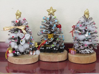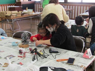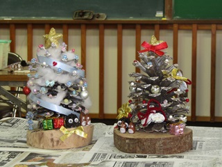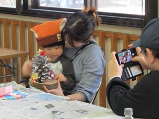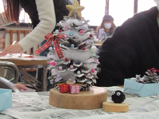 12月7日(日)に「親子で松ぼっくりのクリスマスツリー作り体験」を開催し、6組の親子に参加していただきました。 初めて見る大王松(だいおうしょう)という巨大な松ぼっくりに興味津々。 色とりどりのオーナメントや脱脂綿の「雪」で飾り付けた後は、モミジバフウの「まっくろくろすけ」やドングリの「トトロ」を添えると、大王松はクリスマスツリーに大変身。 もうすぐクリスマス。お父さんサンタさん、プレゼントは松ぼっくりツリーの横にどうぞ。