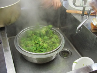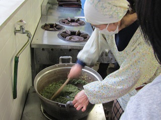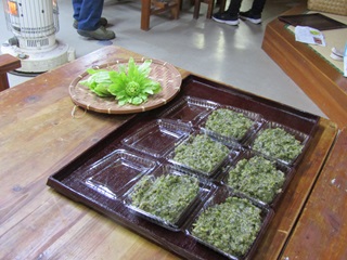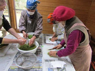 園内で収穫したフキノトウを熱湯にくぐらせると独特の香りとともに鮮やかな萌黄色に変身。女子会のノリの会話とともに粗みじんに刻み、大鍋で味噌とあわせると程なく「フキ味噌」が出来上がりました。