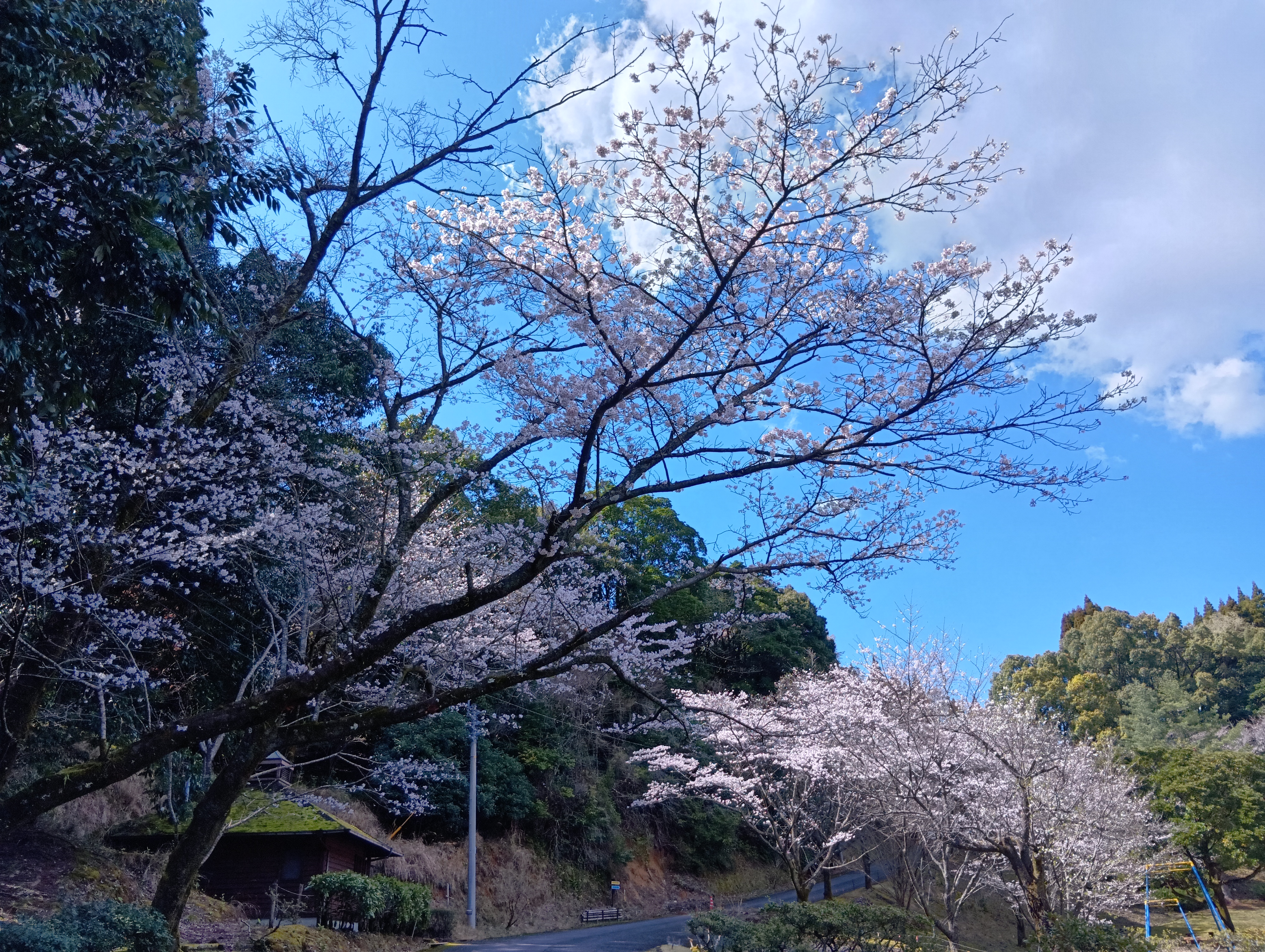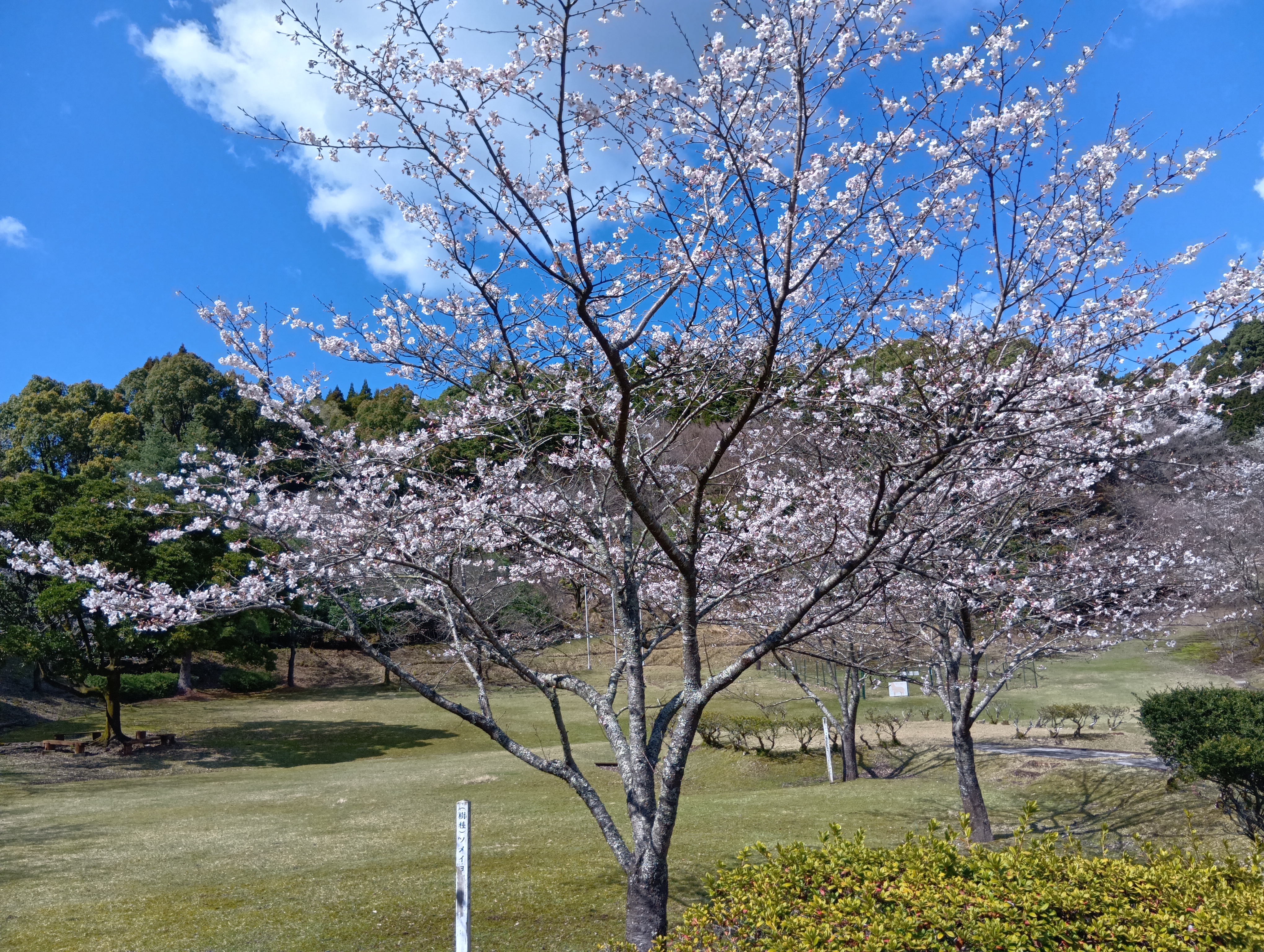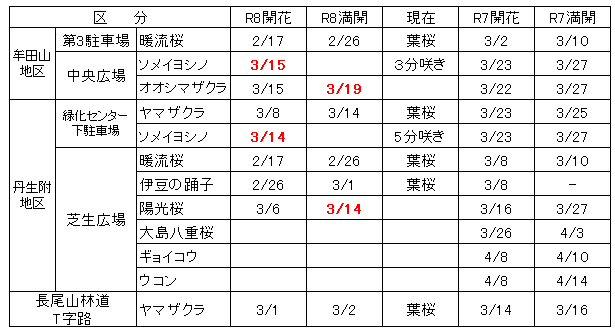 牟田山地区は中央広場だけ遅れ気味ですが、長尾山線沿いや炭焼き小屋前などほぼ満開です