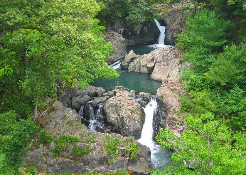 吊り橋は、長さ60m、川面までの高さ27mとスリルあり、奥まで行くと三重の滝が一望できます。